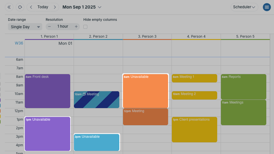 Many people use Teamup to show not only events, but also people’s availability and schedules.