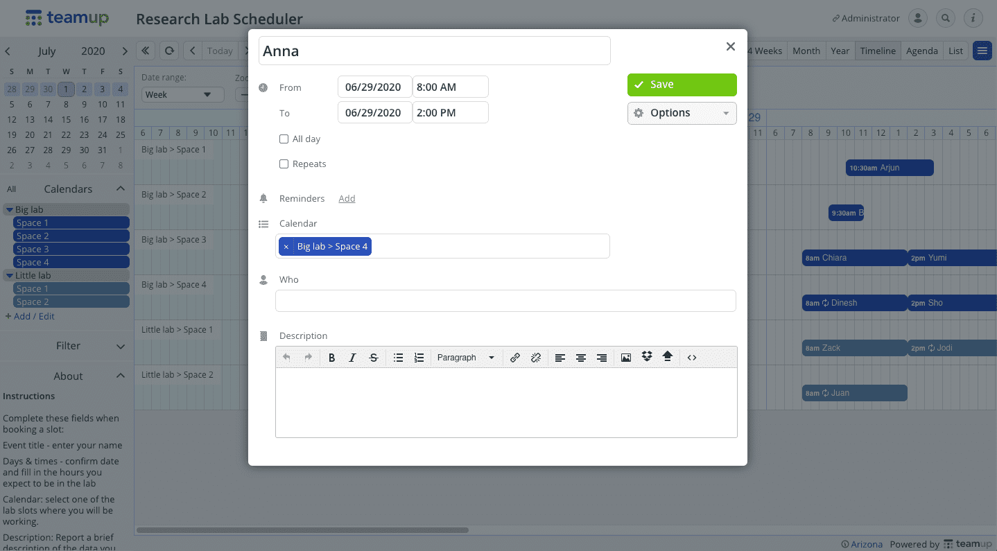 The team leader signs up as the calendar administrator to create the sub-calendar structure: assign one color-coded sub-calendar for each piece of equipment, room, or lab slot. This allows for implementing occupancy limits.