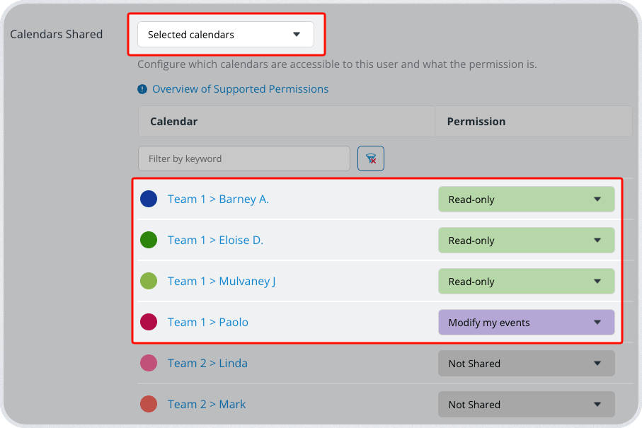 For example, team member Paolo may need to view the schedules of their colleagues, but only manage events on their own sub-calendar. For Paolo, the most secure access would be: