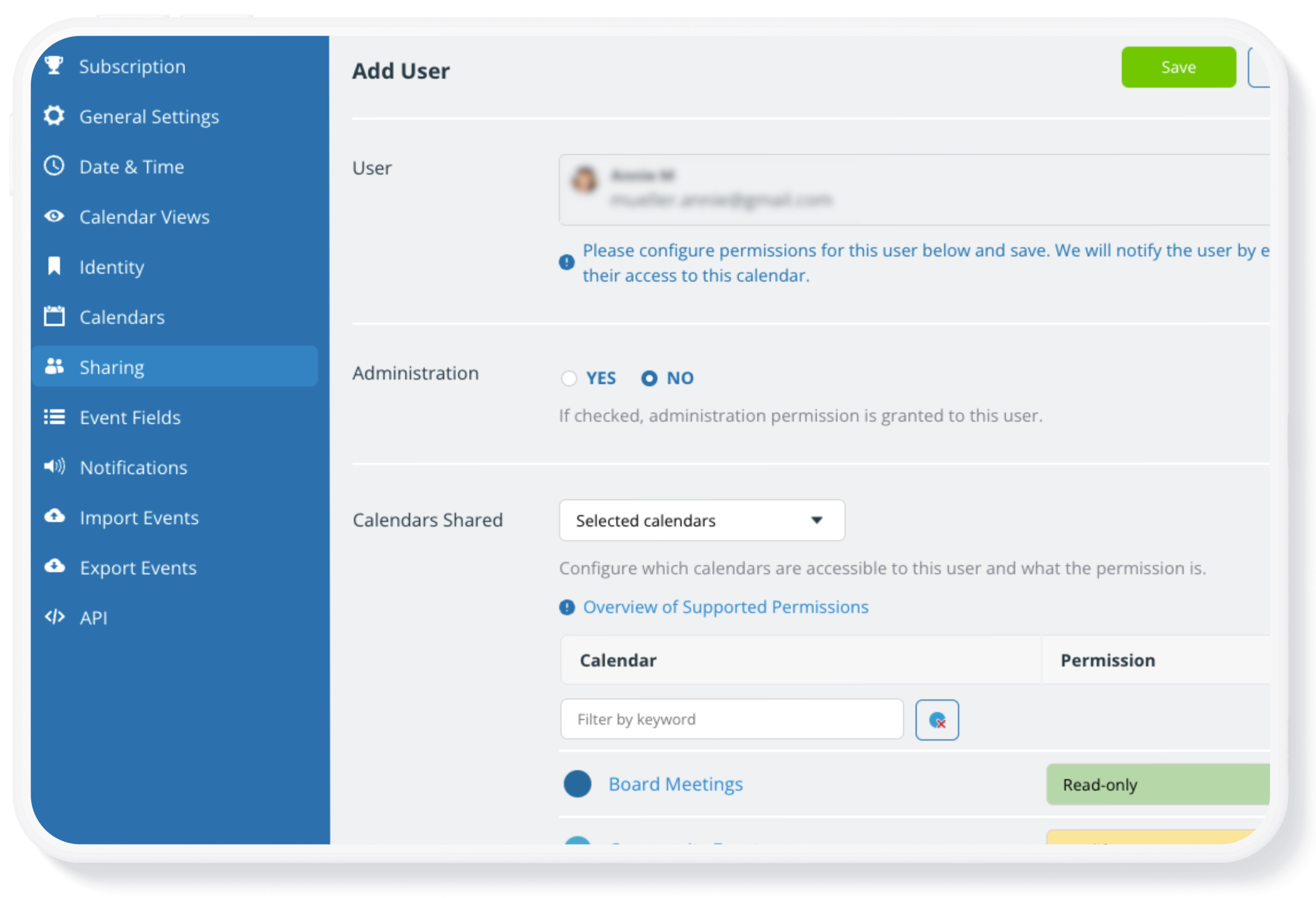 Administrator access is the highest permission level and provides full control over the calendar data, settings, access, and subscription. Because administrators have complete control over the calendar, administrator access should be restricted. Only the people responsible for managing the calendar itself should be given administrator access. We recommend that only one or two people are designated as calendar administrators.