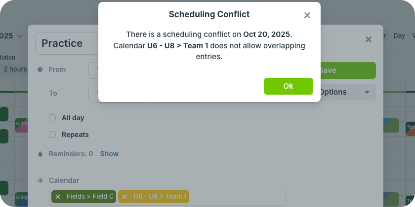 Then there’s the practice schedule. Teams usually get a regular weekly practice time and stick with it: same time, same field, no problem. But reality happens. A coach is unavailable so the practice time needs to change this week. Or a field needs maintenance, so the team needs to practice somewhere else. Making these simple shifts comes with the same risks: schedule conflicts aren’t easy to spot, and overlapping events aren’t automatically prevented. Two teams show up for practice at the same time, on the same field, and nobody knows quite how it happened.
