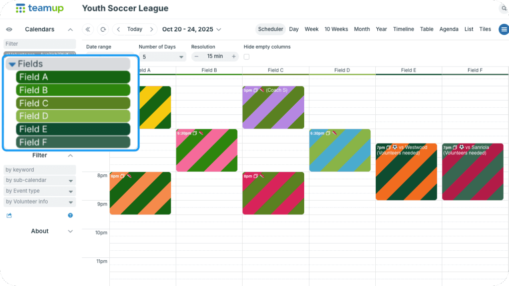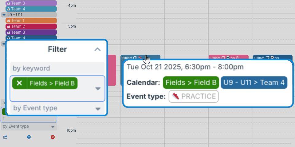 When you’re working with a complex schedules, zooming in on a specific field, team, or event type can take time. Teamup’s built-in filters let you zero in fast, showing exactly when a particular field is booked or a team is scheduled to play.