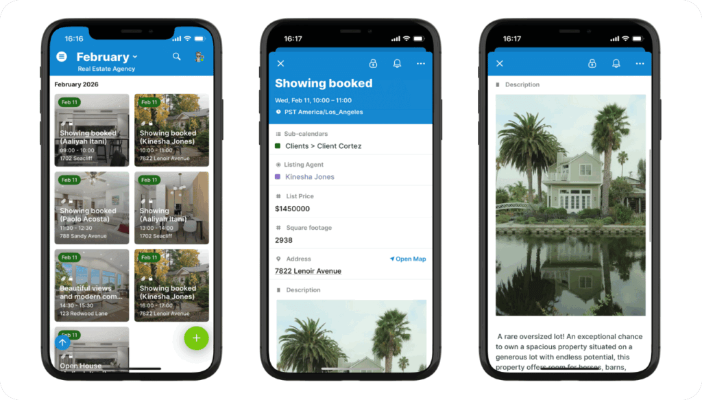 • They add listings as separate events with key details plus photos and documents for each property.