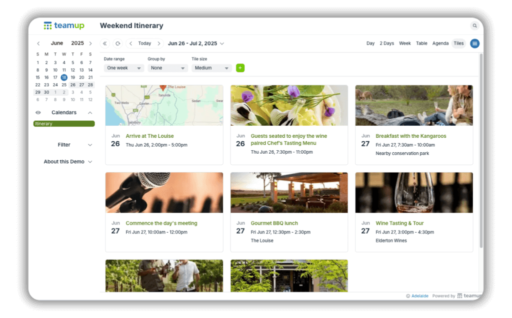 With the introduction of Tiles view, Teamup is expanding what a calendar can do. By displaying images uploaded to events, Tiles view turns your calendar into a more visual and intuitive space. It’s easier to see key information and get jobs done. Now this feature isn’t just on the web: It’s available on the Teamup mobile apps too, opening up new ways to work more efficiently and communicate visually.