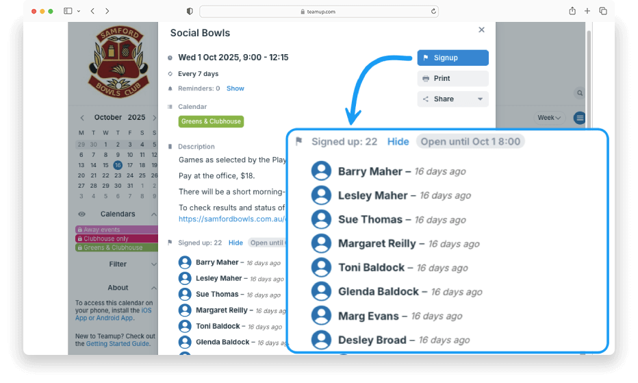 If your Teamup calendar uses signups, having an account makes signups smoother. You can sign up, get e-mail confirmation details and remove your signup from the event if plans change.