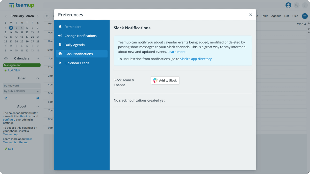 If your team uses Slack, you can set up the Slack integration to receive Teamup Calendar notifications in a Slack channel, including pop-up alerts on desktop or mobile via the Slack app. If you spend a lot of time in Slack, this can be an easy way to stay on top of schedule changes and reminders, whether it’s for team meetings or personal to-dos. Pro tip: double-check that notifications are sent to the right channel (and keep personal notifications in a private channel).