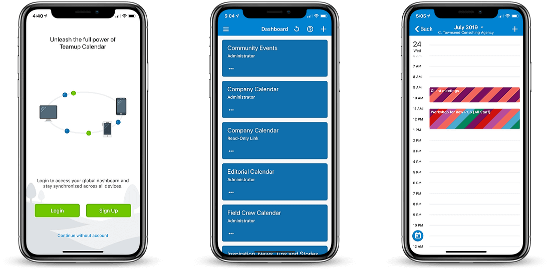 With a Teamup user account, you can log in on your desktop browser, or download the Teamup app and sign in to access the calendars on your dashboard anywhere. Every event, including like notes, links, or file attachments, will be available across your devices on: