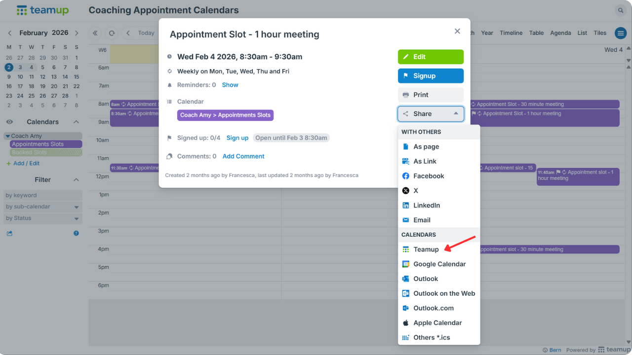 To share an event to another Teamup calendar, you need to be logged in to your Teamup account. When you choose Share > Calendars > Teamup, you can select a destination calendar from your calendar dashboard.
