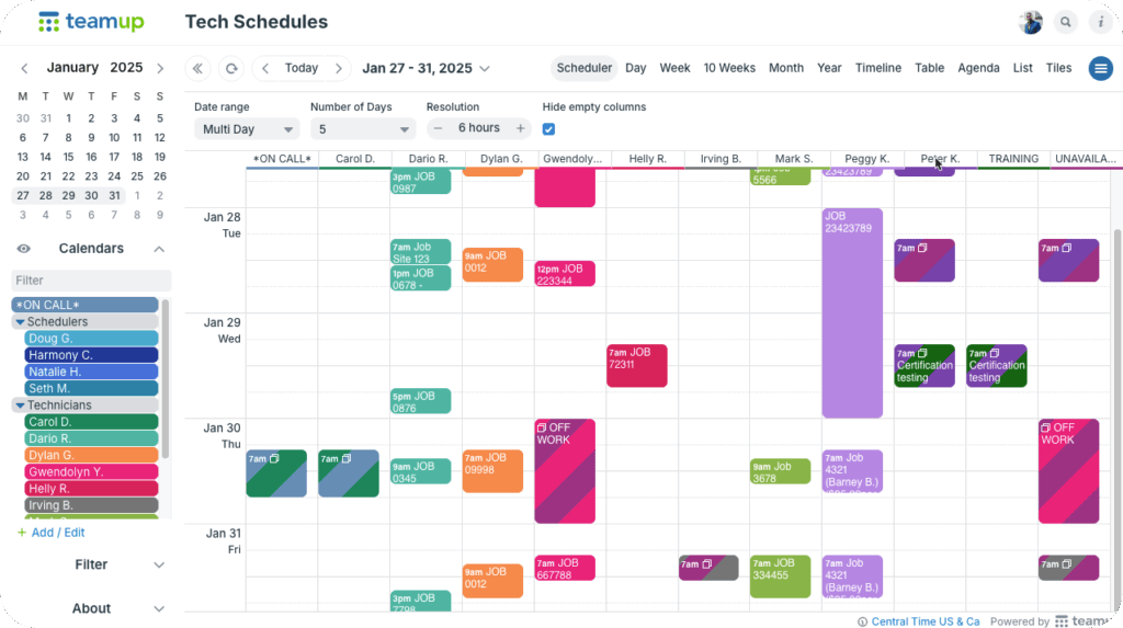 Field technicians check the app instead of calling for updates, and everyone works from the same, current schedule. Each technician sees only their assigned jobs, keeping data secure and organized. The office updates once, and the whole team stays in sync. Give it a try: Create your Teamup calendar today.