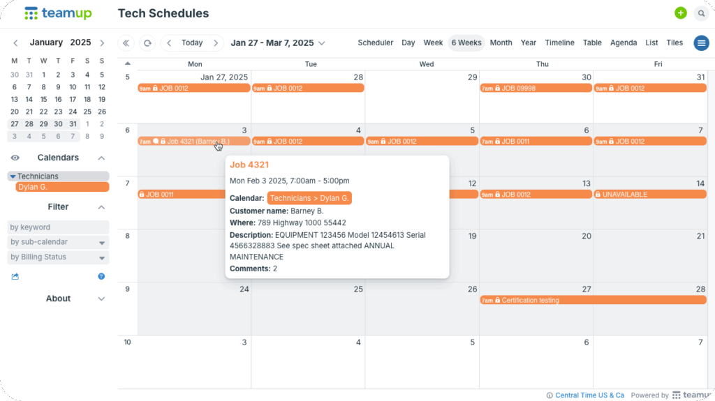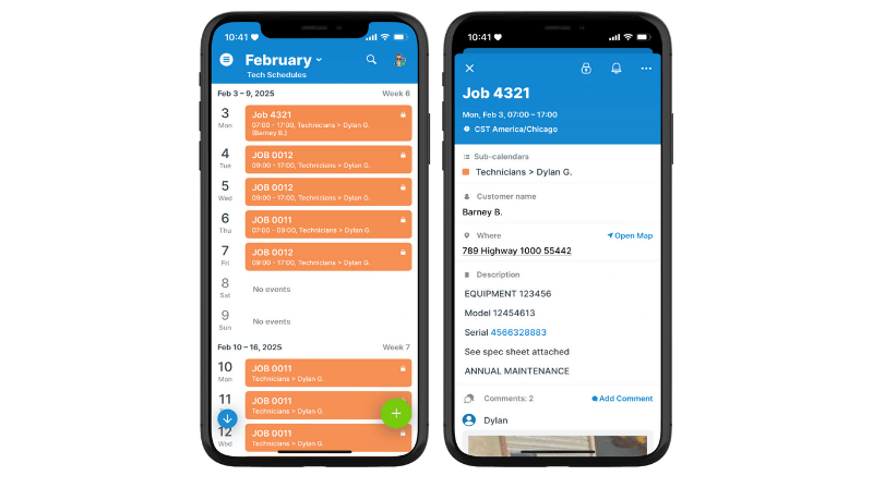 Technician Dylan’s view on the Teamup app: He sees only his own scheduled jobs with the info he needs, nothing more.
