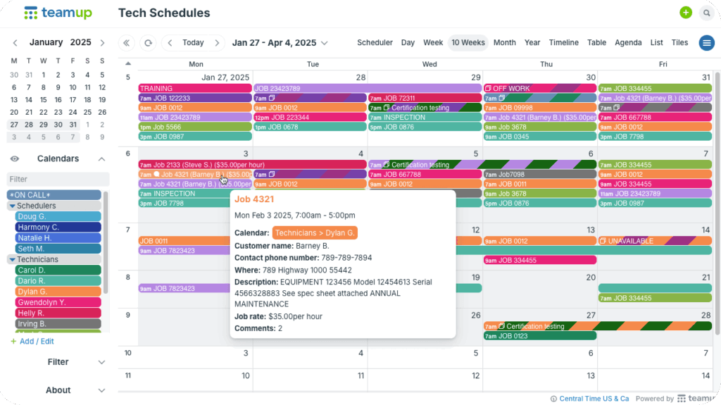 - Create separate sub-calendars for the techs. Organize in folders by team or department.