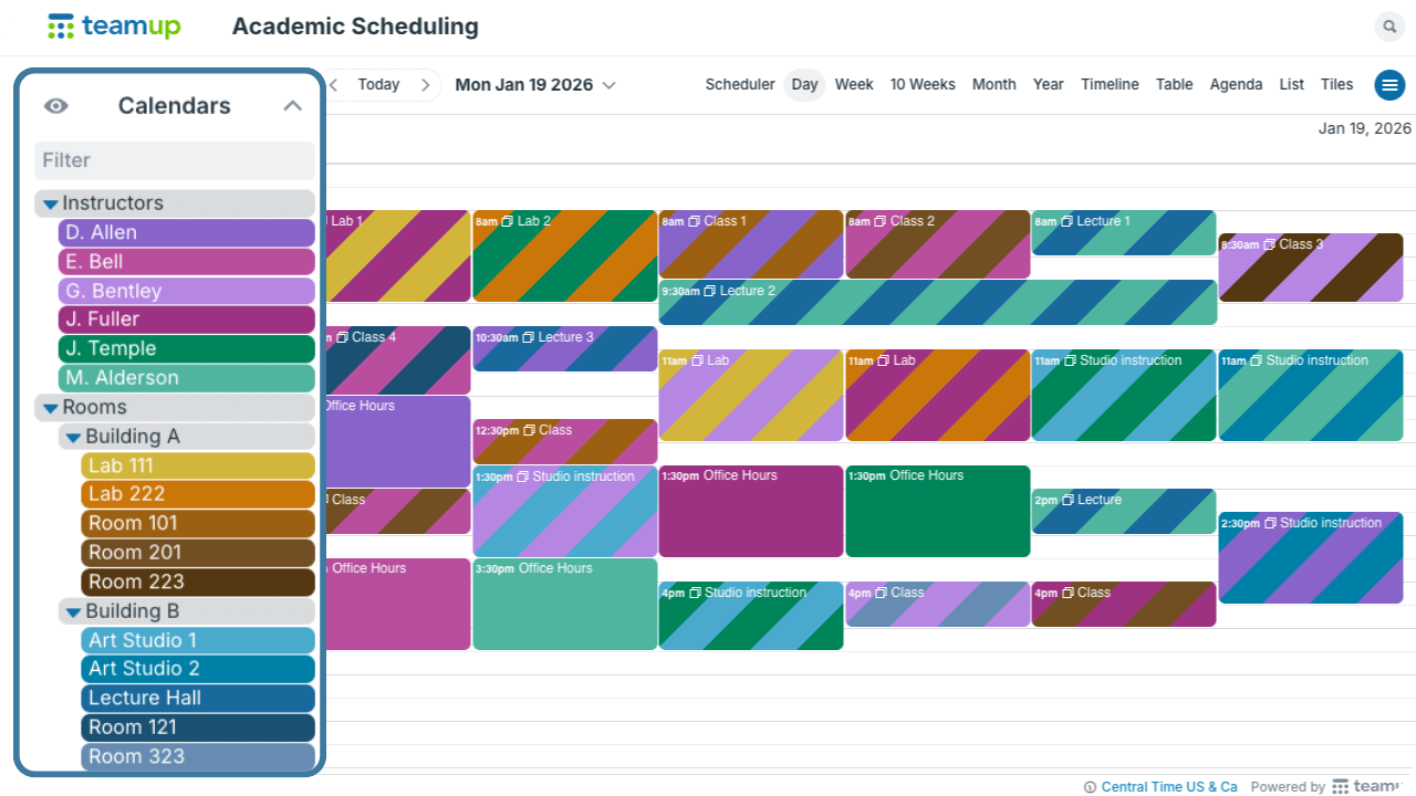 A calendar for scheduling classes can be set up with two primary sets of sub-calendars. The first set is for instructors; each instructor has a sub-calendar, and these calendars are grouped in a folder. The second set is for locations: namely, individual rooms where classes will be held. There are several buildings, so these calendars are grouped in nesting folders to keep them organized by building. All the sub-calendars disallow overlapping events to prevent double-booking instructors or classrooms.