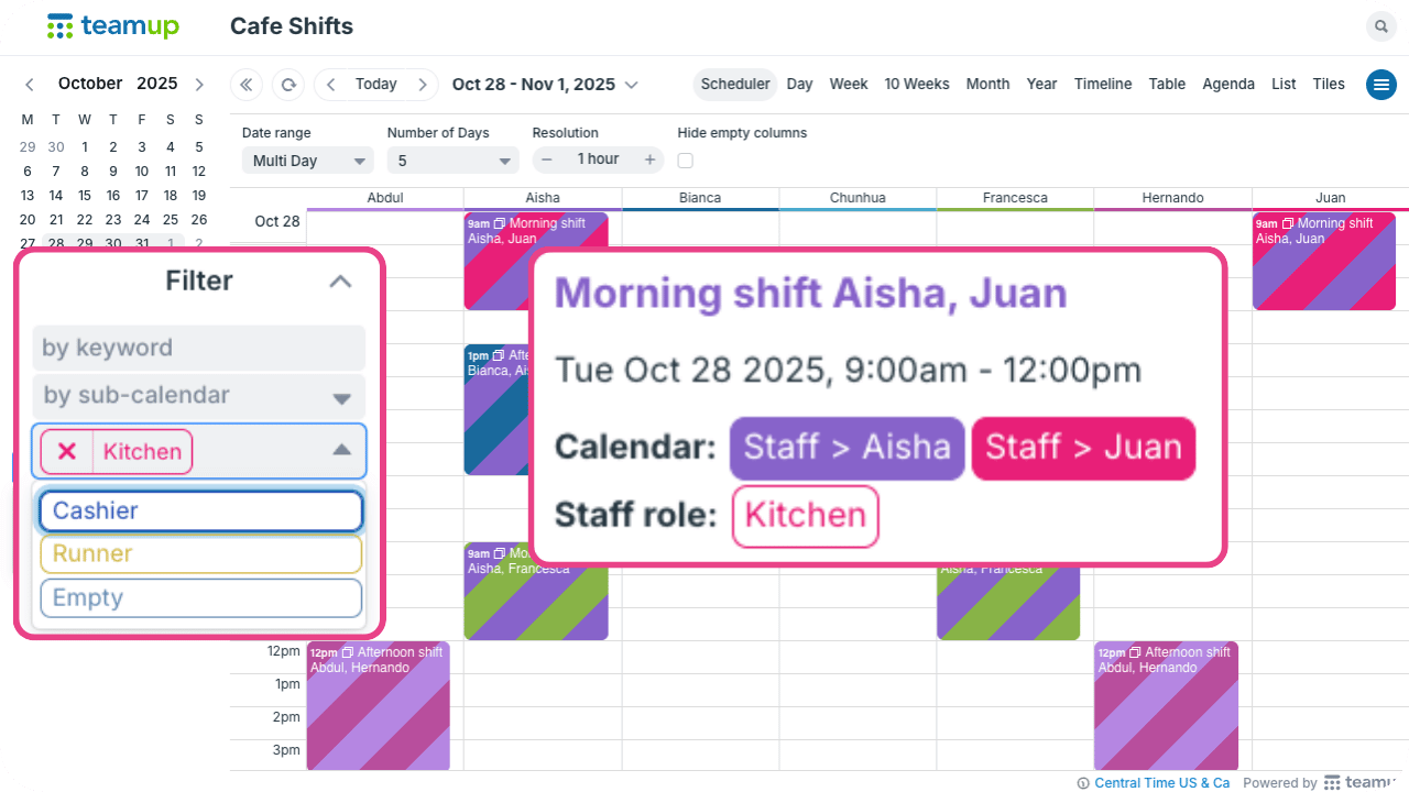 On the shift scheduling calendar above, the manager schedules each staff member by adding events to their calendar. This tells each staff member when they’re working. If the manager also wants to assign specific roles or tasks, a custom field works well. For example, a custom field could be added for Shift responsibilities or Staff role.