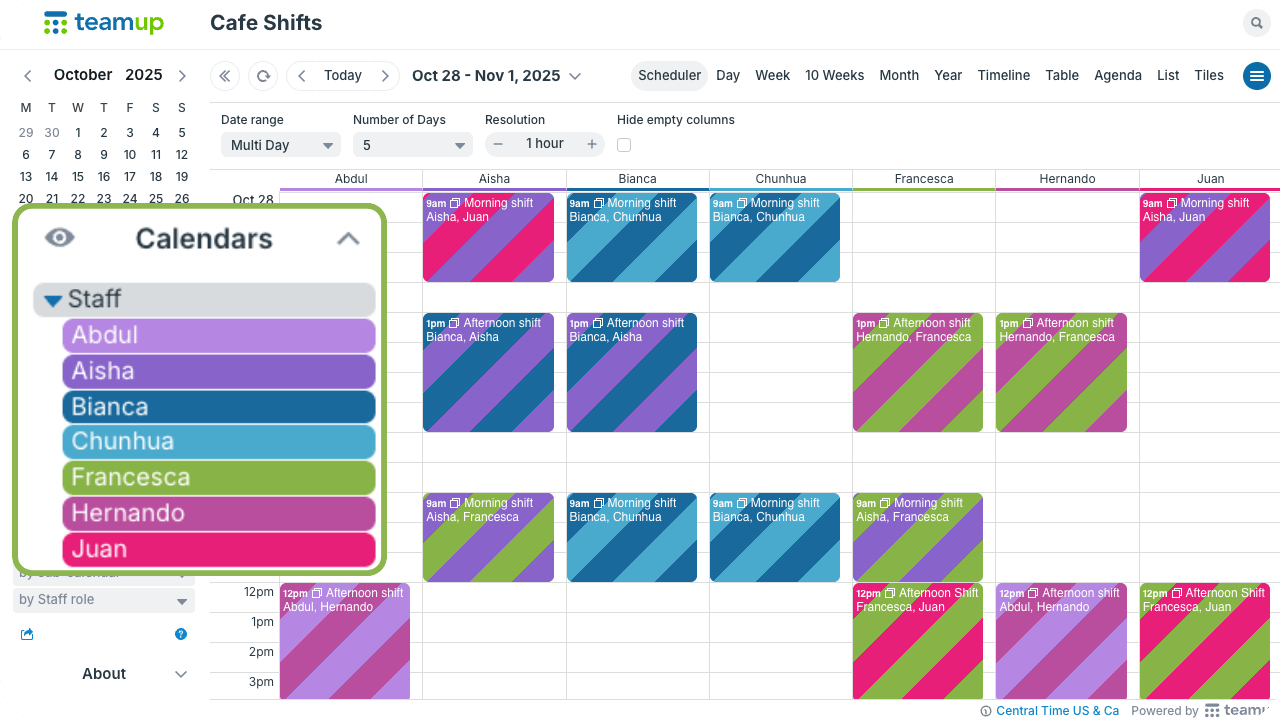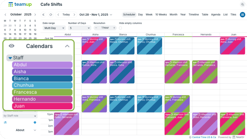 Typically, sub-calendars are best for the primary scheduling categories, like staff members, projects, or locations. Sub-calendars have access control, automatic conflict prevention, and color-coding built in. For primary scheduling dimensions, those features are invaluable. Take a look at these examples.
