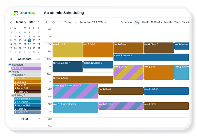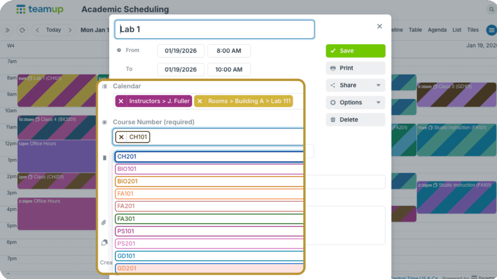 For academic scheduling, each class session is added to the calendar for the instructor and the classroom. Schedulers may also want to track the course number for each class, so they can then look over the whole calendar and make sure there are adequate classroom hours to meet the different course requirements. They can add a custom choice field, prefilled with the course numbers. Then each class can be “tagged” with the appropriate course number by choosing it from the field. Schedulers can filter to see all the scheduled classes, and total hours, for any course. Having the ability to filter by course number across all sub-calendars helps schedulers find the info they need quickly.