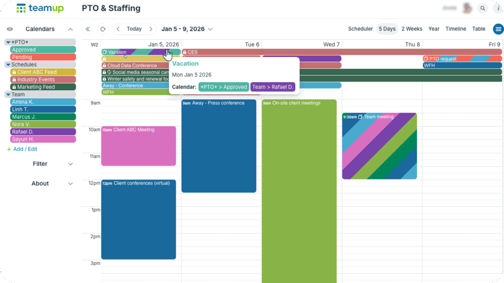The Teamup solution: A shared vacation leave tracking calendar that centralizes all time off in one view, giving managers and HR clear visibility to spot conflicts early and make informed approval decisions.