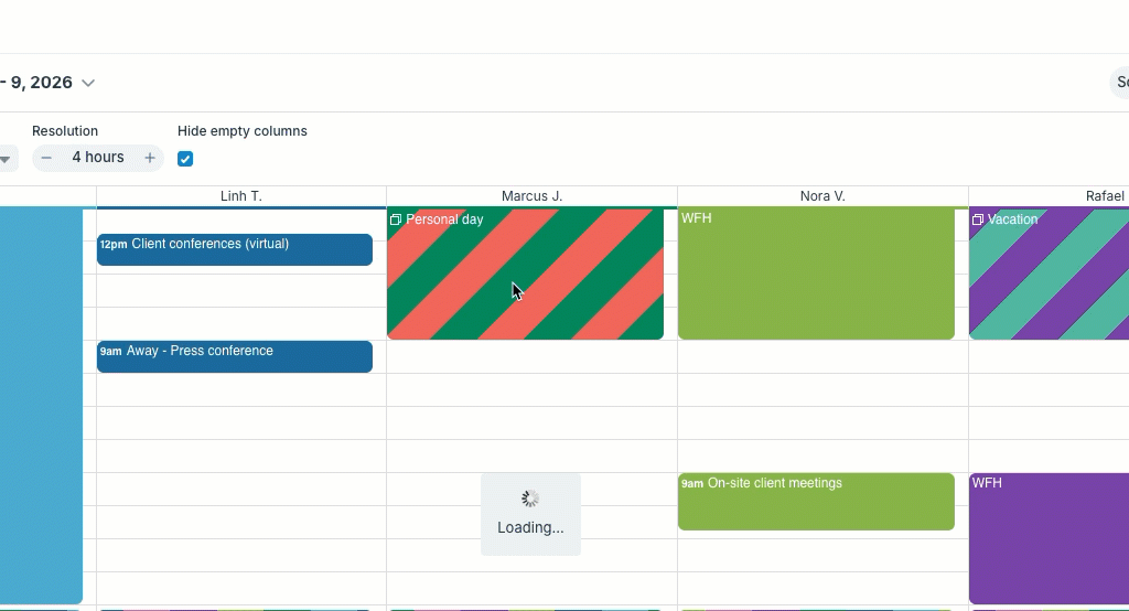 It’s difficult to plan coverage when employee time-off is scattered across emails, spreadsheets, and different tools. A shared PTO calendar puts all absences in one view to make conflicts obvious, avoid workload bottlenecks, and schedule staff efficiently.