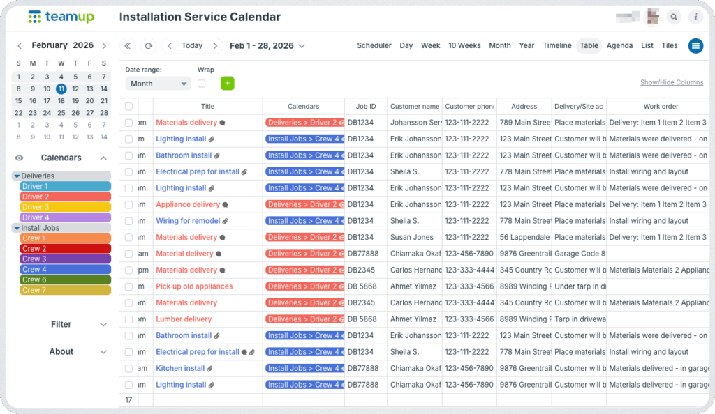 Teamup turns the calendar into the place where all the information lives. Deliveries are documented. Installation instructions are right where they should be. Everything syncs automatically. Drivers and installers on the field can get the information they need and work efficiently. Office staff can see the latest real-time updates from the field and stay aware of timing changes and job completions.