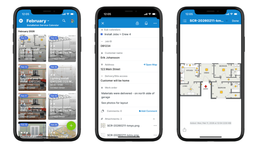For installers, clear instructions mean showing up prepared. Tiles view on the app shows jobs in a clean visual grid so installers can see what’s ahead and quickly spot the next job on the schedule. Layout plans, diagrams, and notes provide context before any work begins. Instead of guessing or calling the office, installers can view attachments on-site, check details and instructions, and get started without delay.