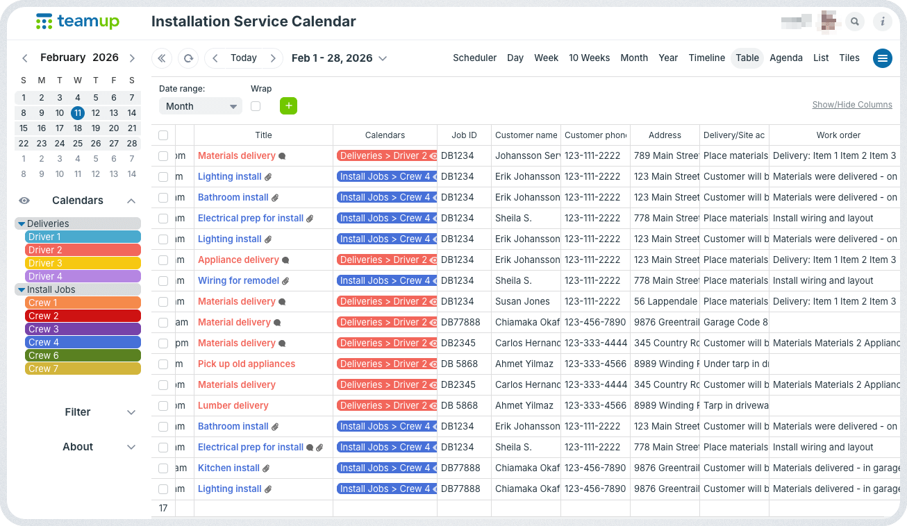Teamup turns the calendar into the place where all the information lives. Deliveries are documented. Installation instructions are right where they should be. Everything syncs automatically. Drivers and installers on the field can get the information they need and work efficiently. Office staff can see the latest real-time updates from the field and stay aware of timing changes and job completions.