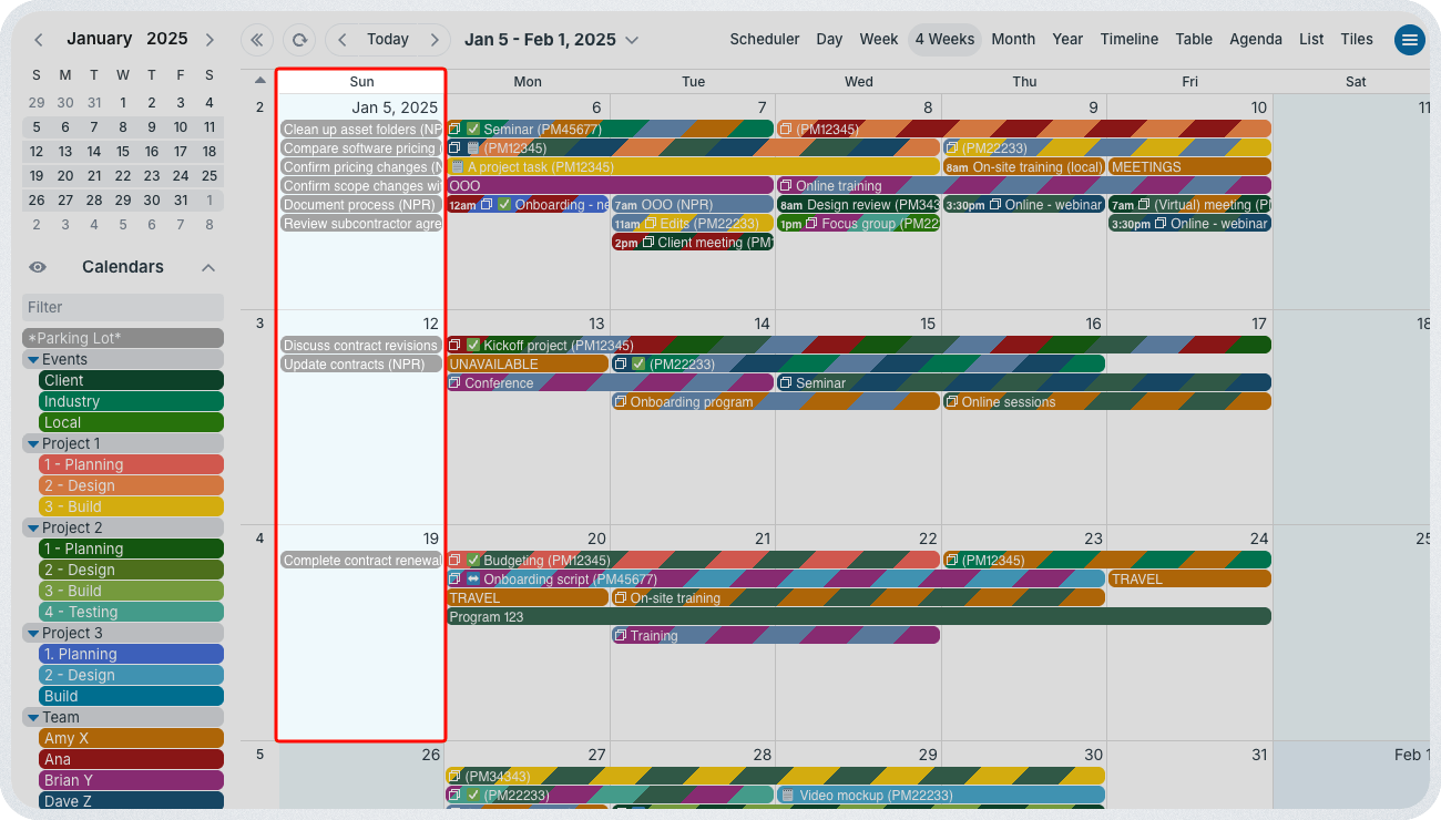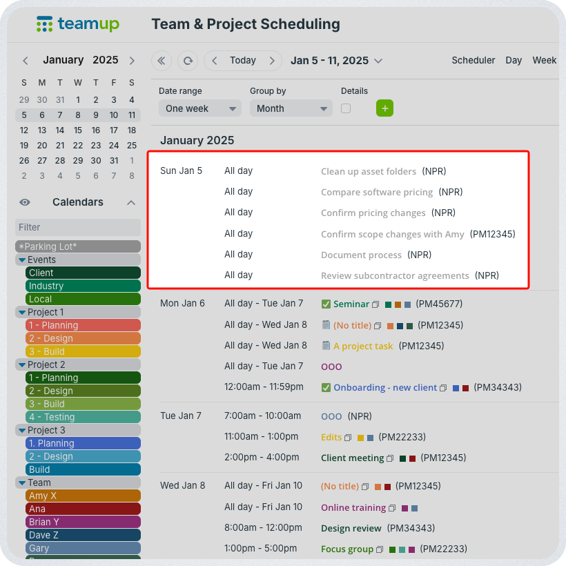 In Teamup, create a designated sub-calendar for unscheduled tasks. Then, choose a specific day each week or a placeholder day at the start of the month. This is the parking lot: All unscheduled tasks live here until they are completed. The key is to choose a parking lot date that will be visible in the default calendar view. This keeps those unscheduled but important tasks visible. They’re alongside scheduled events and tasks, so teams can work from a complete picture of what’s happening or needs to happen.