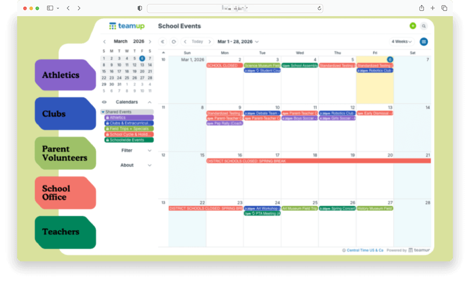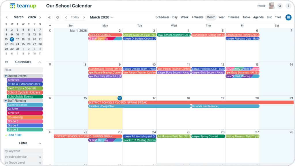 The Teamup solution: A school calendar with customized, read-only access to only certain sub-calendars can be embedded right on the school website. Parents can view all the info for shared events, but sub-calendars with staff-only events and planning aren’t shown.