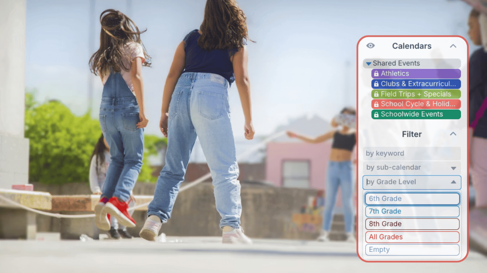 The need: Schools need to provide parents with accurate scheduling info for class times, field trips, sports schedules, and other school events, while protecting staff-only events and planning.