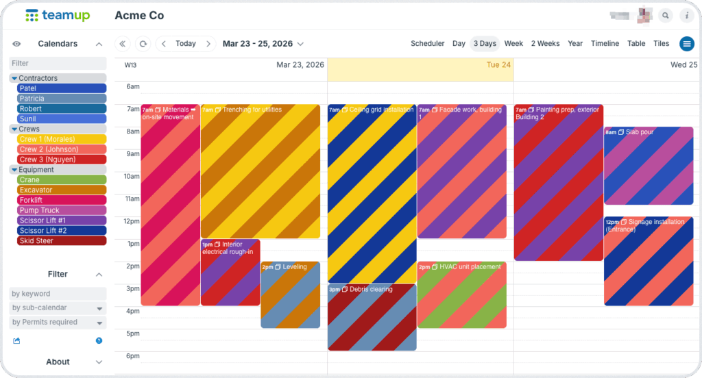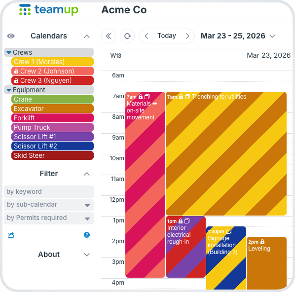 With Teamup, crews can plan their work with confidence, project managers can maintain oversight, and equipment is used more efficiently across the site. Get started with your own construction equipment calendar to keep projects running smoothly.