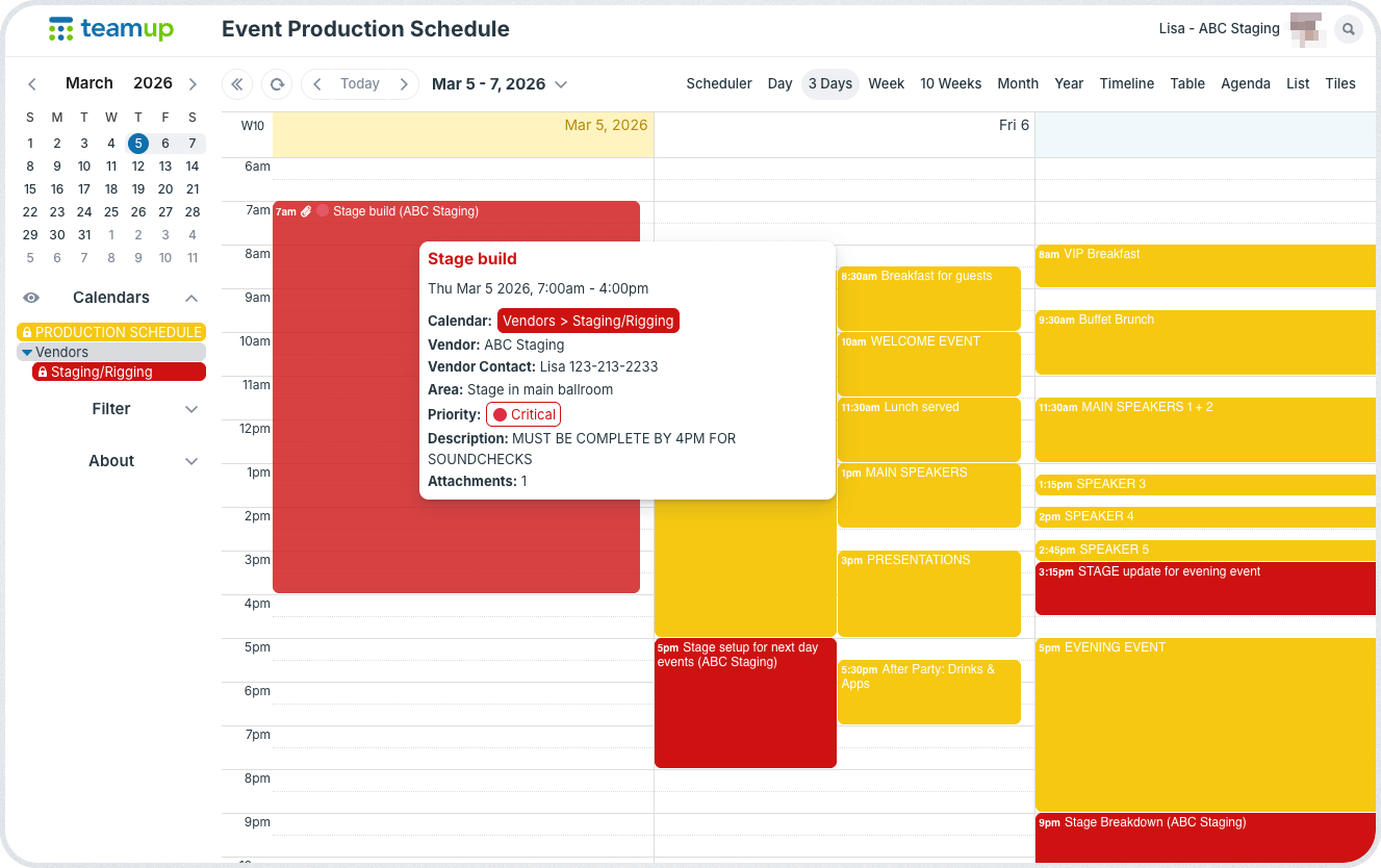 A structured event calendar allows planners to centralize updates while giving vendors clear visibility of crucial timing and job details.