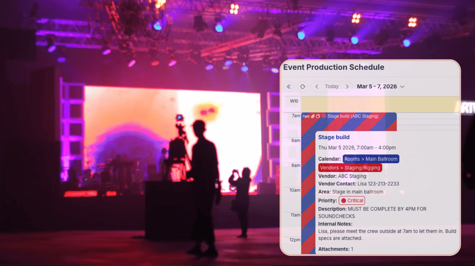 On event days, timing is everything. Vendors need to know when they can access the venue, when staging is complete, when AV begins installation, and when rehearsals are scheduled. Clear schedule visibility reduces miscommunication and prevents vendors from arriving too early or too late.
