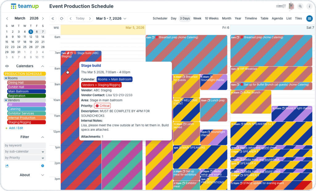 - Use sub-calendars to organize jobs by vendor category (AV, staging, catering, exhibitors).