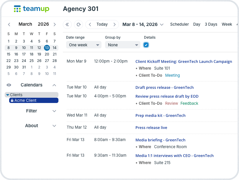 The Teamup solution: A shared calendar that allows agencies to manage full internal project planning while providing clients a limited, secure read-only view that shows only their milestones, deadlines, and deliverables.