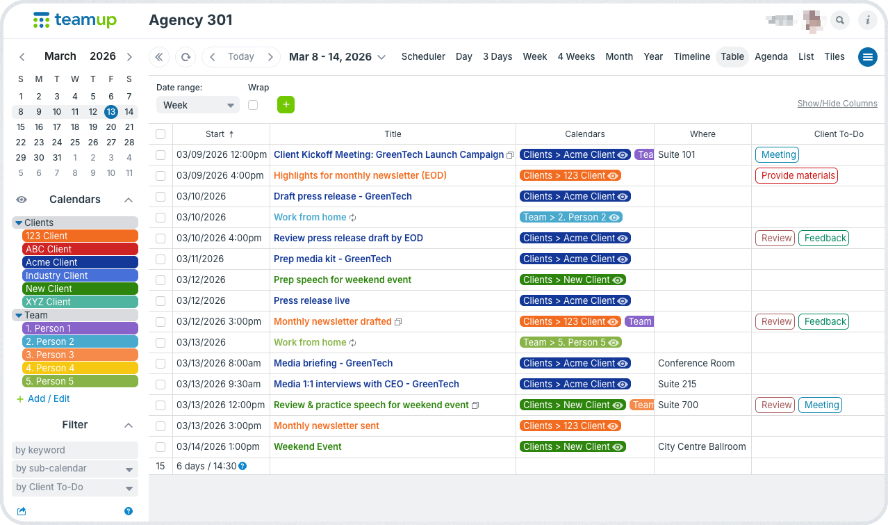 Table view (shown above) provides a spreadsheet-style layout that makes it easy to scan across event details in one place. (Be sure to check out other calendar views, too: They provide different perspectives and levels of detail to help make tasks easier and work more efficient.) Internal team members can work efficiently, while only approved milestones are shared with clients: