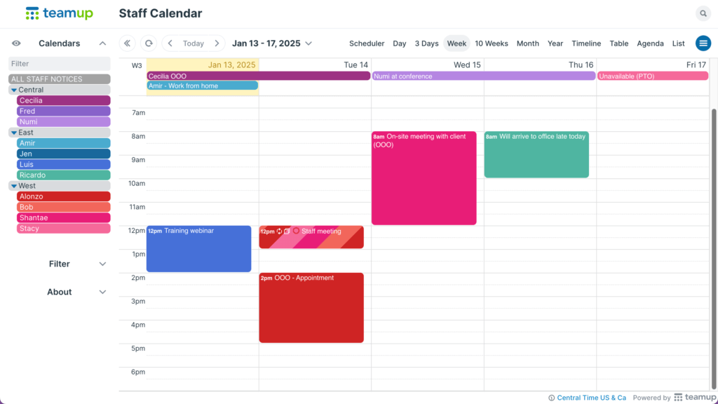 - Each staff member can add their events such as meetings, client calls, or other items to their own calendars; the events indicate times when they’re not available for other things.
