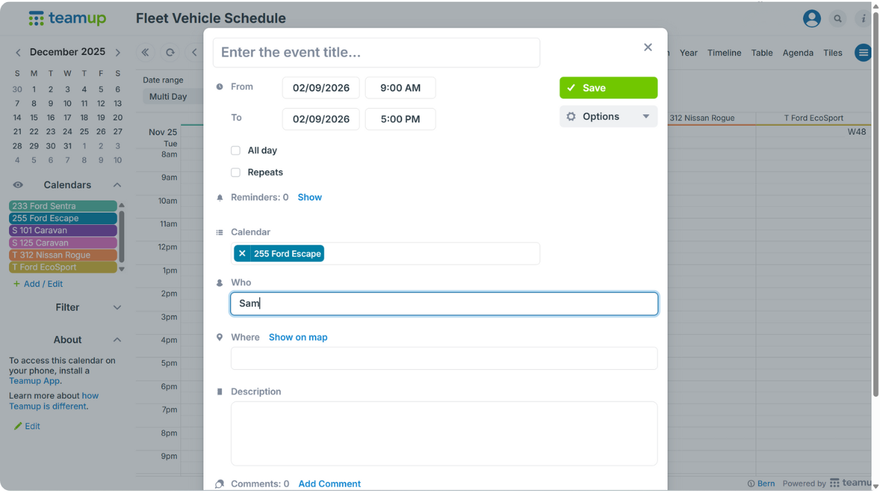Using Teamup calendar, it’s easy to dedicate a unique sub-calendar to each vehicle and display all bookings of any specific vehicle in a single column on the Scheduler view, with multiple vehicles displayed side by side. This creates a clear, real-time visibility into the entire fleet in any size. With a single, shared calendar that shows availability instantly — and offers optional self-booking — your team can schedule vehicles without calls, messages, or admin back-and-forth. Instead of digging through messages or spreadsheets. Your entire fleet schedule becomes visual, intuitive, and always up to date.