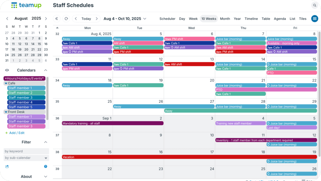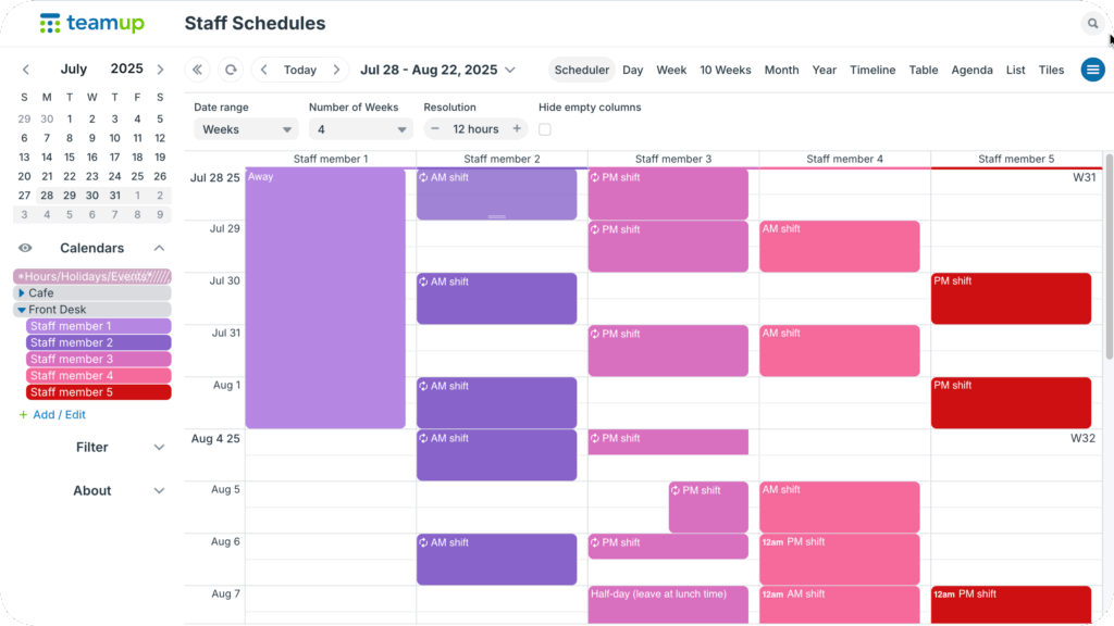 The Teamup solution: A flexible calendar that keeps staff planning organized and makes it easy to quickly spot availability for quick replacements and schedule adjustments.