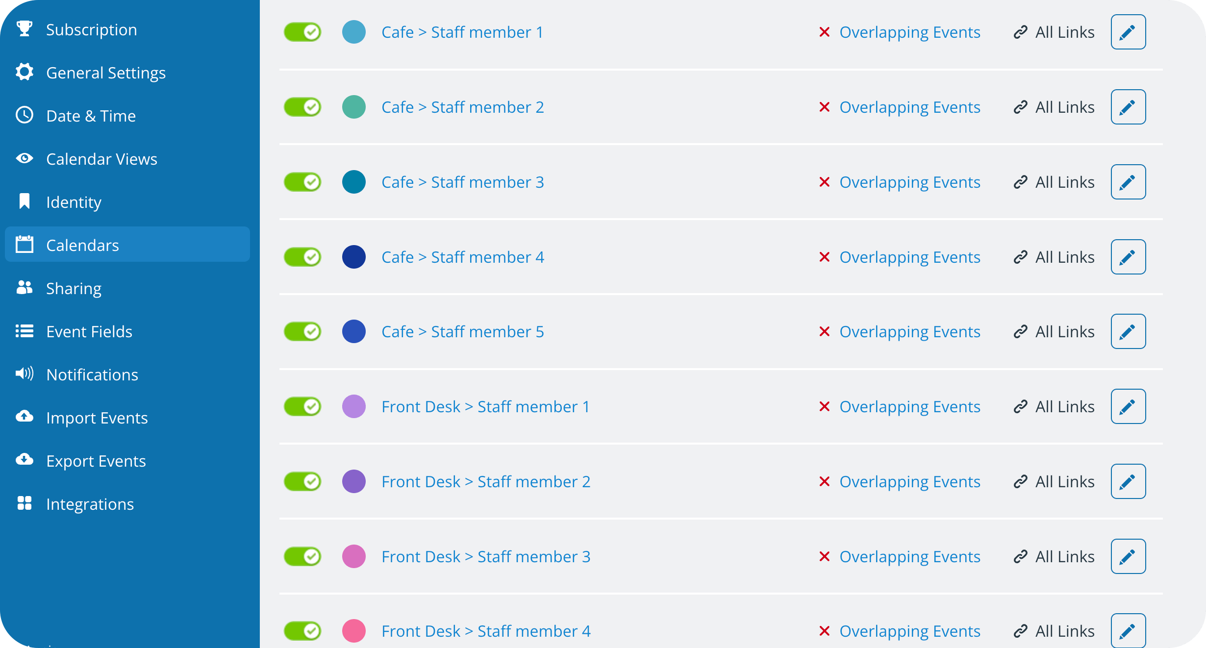 One simple setting can be applied to each sub-calendar to automatically prevent overlapping events. If an event is already scheduled on a particular sub-calendar for a certain time, Teamup won’t allow events that overlap to be added to that calendar. Conflicts are avoided before they can cause issues.