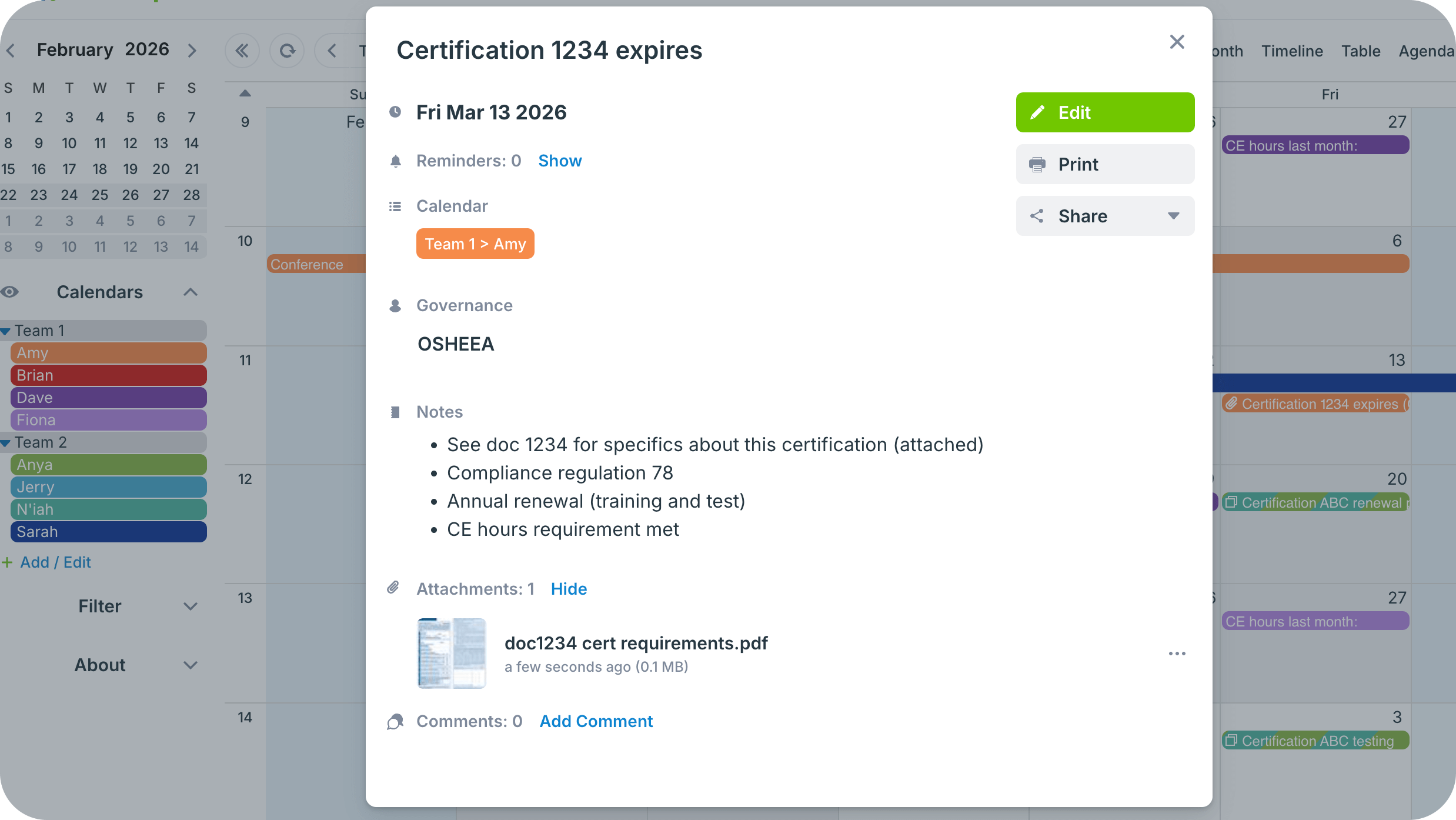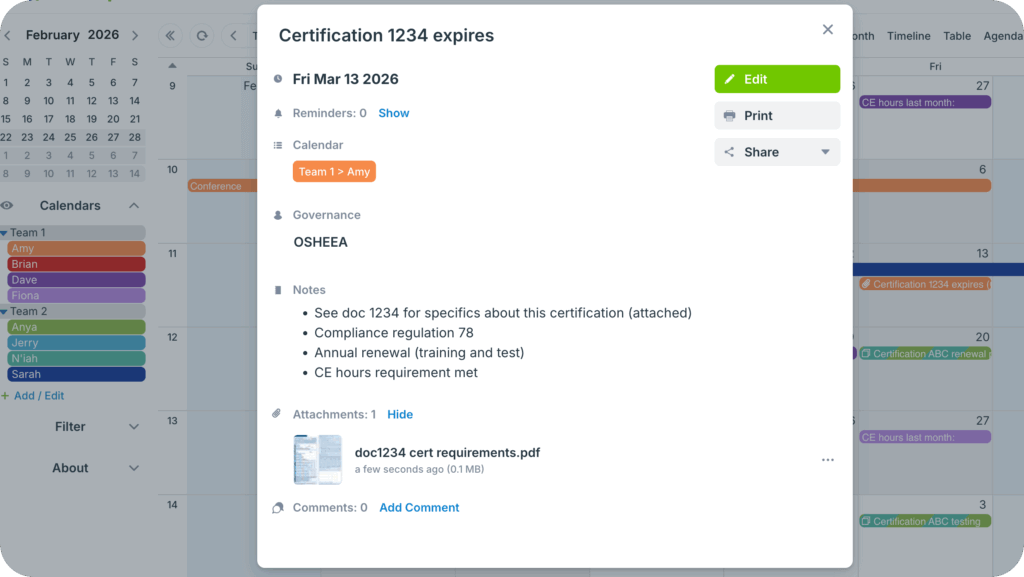 The Teamup solution: A simple calendar to publish training events and important dates for compliance with options for employees to filter by roles or departments.