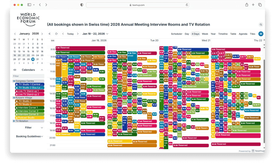 The media room booking operation at the World Economic Forum has been powered by Teamup since 2017. For this year’s WEF mega event with a record-breaking number of attendees, 750+ bookings were made during a packed 5-day period. Media professionals were able to access the booking calendar on a phone or any web browser to check availability and make reservations. Color-coded calendars and built-in filters made it easy to navigate the busy calendar. Customized calendar access for each organization kept things secure: Booking details were kept confidential, visible only to the professionals within each organization.
