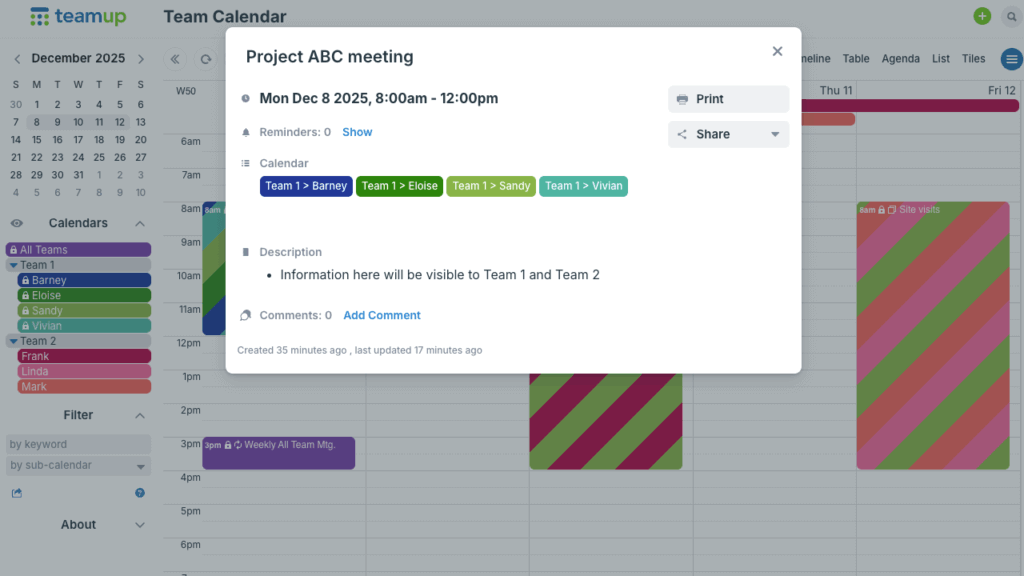 Teams need a reliable way to categorize what goes on the calendar, and capture and organize all the details for each event, task, or meeting. Managers need quick, understandable visibility of milestones, resource use, and project progress. Most calendars can’t provide the needed structure for flexible organization along with high-level views. Good news: Teamup can.