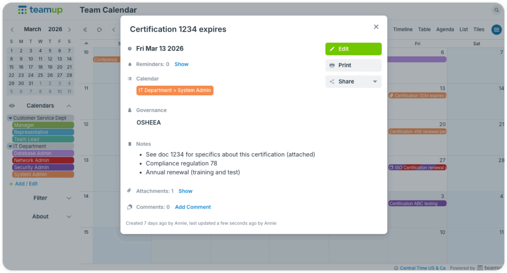 Safety and compliance managers are responsible for ensuring that mandatory training is done and certifications are renewed on time. A shared calendar helps with keeping track of compliance requirements for each role or department and planning ahead to provide adequate training and testing opportunities.
