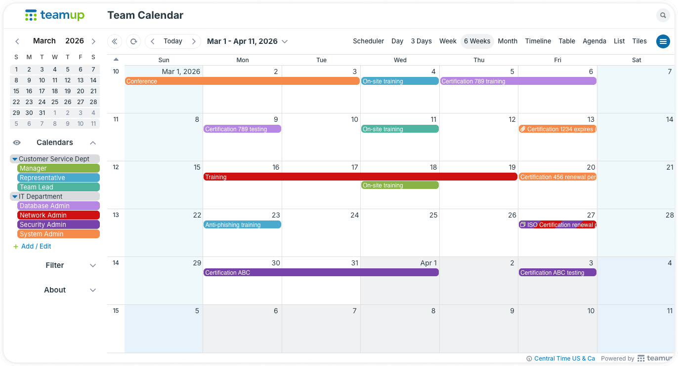The Teamup solution: A simple calendar to publish training events and important dates for compliance with options for employees to filter by roles or departments.