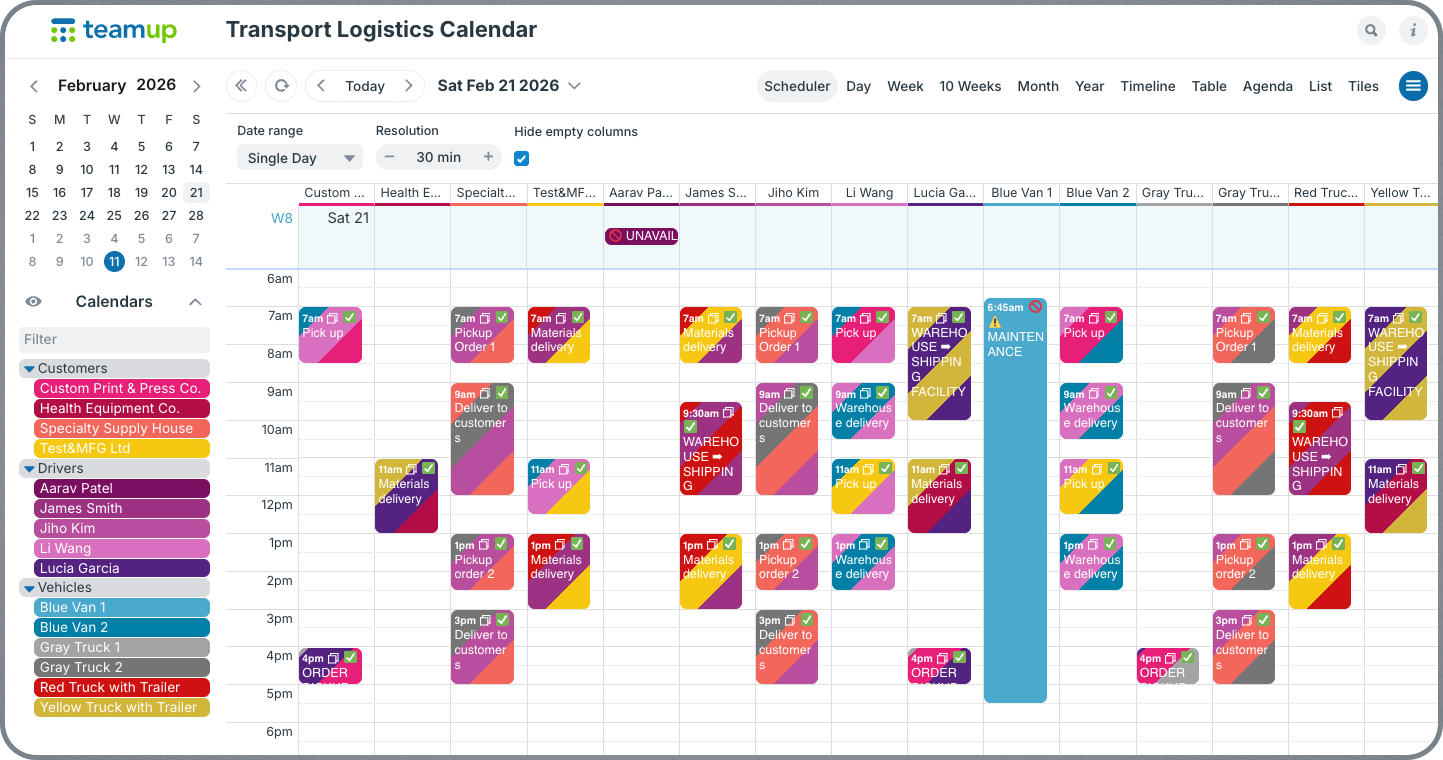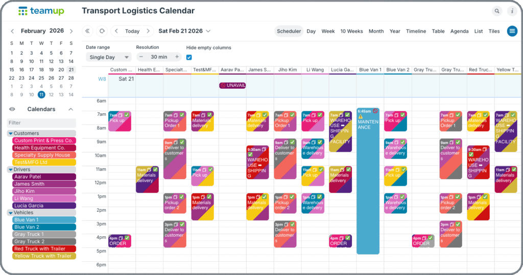 The Teamup solution: A shared logistics planning calendar that keeps each transport job organized, gives drivers a clear view of their assignments, and provides synced timing updates for customers.