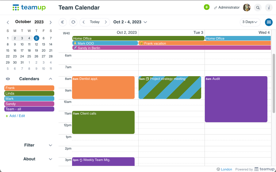 Teamup includes two flexible variations of the classic Day and Week views: Multi-Day and Multi-Week. These views are adjustable: While the administrator can set the default number of days or weeks in the calendar settings, any user can append a link parameter to show the calendar in a specific date range — for example ?view=md4 for a 4-day view or ?view=mw52 to display all events for the upcoming year.