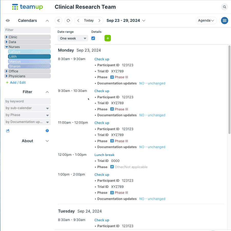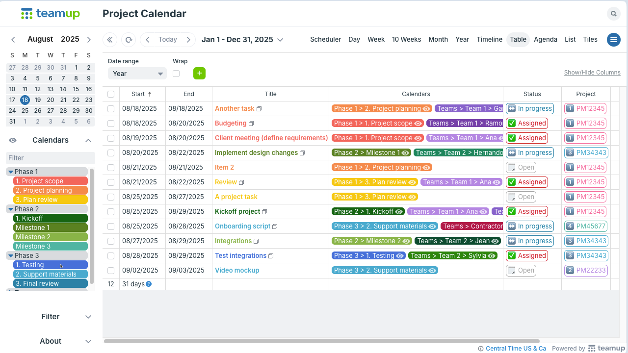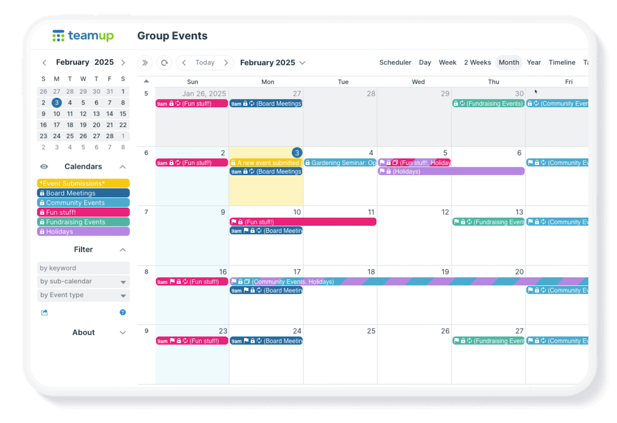 With Teamup’s rich set of 12 calendar views, you can choose the format that best fits your task — whether you’re planning across days, weeks, months or the whole year. And beyond time-based planning, Teamup’s flexible views can also support a range of workflows, including team coordination, resource scheduling, availability management, task progression, and booking or reservation management.