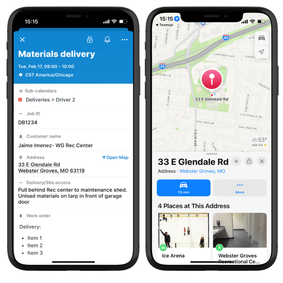 Click to enlarge: On the Teamup app, any field with map integration enabled will open an address in the Maps app for quick directions.