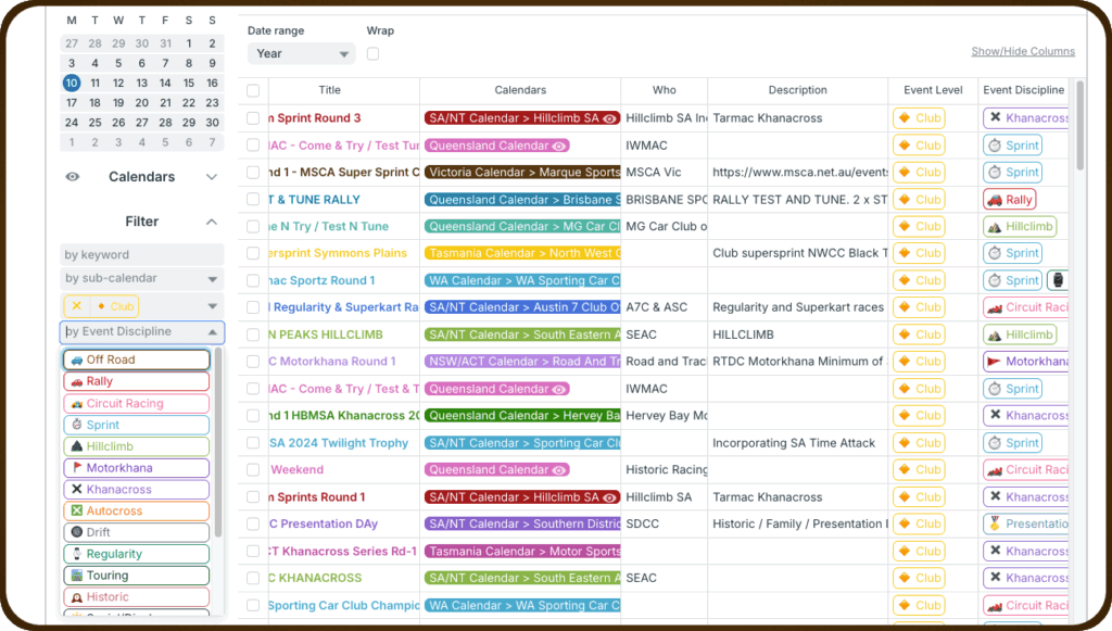 Click to enlarge: Motorsport Australia uses color-coded calendars and custom choice fields with built-in filters to keep their busy events calendar cleanly organized and easy to navigate.