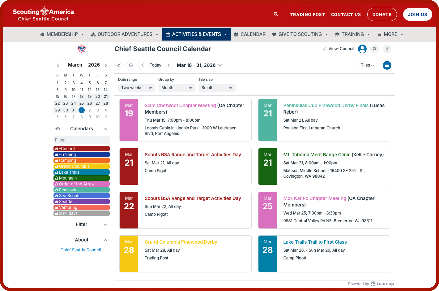 Click to enlarge: A scouting group’s calendar, embedded on their website, displays events color-coded by territory and event type.