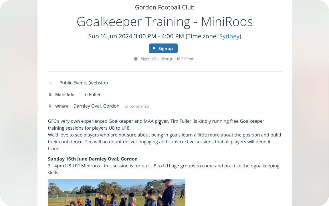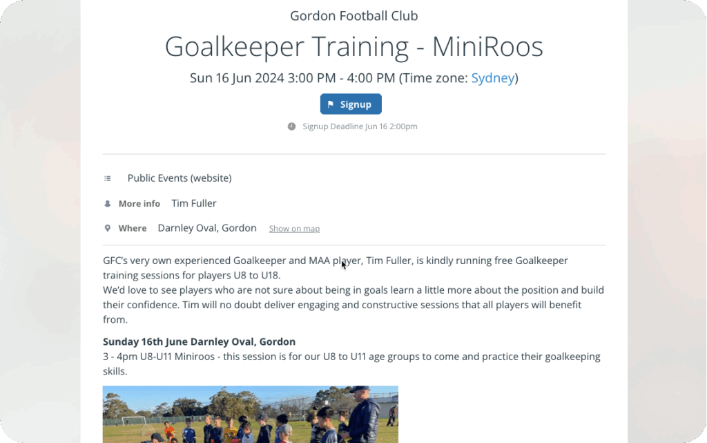 With event pages, sharing and promoting individual events is quick and easy. Coaches can encourage participation in training events by sharing an event page on social media. Parents can share game or tournament info with grandparents by sending an event page link. If the event is changed on the calendar, the event page updates automatically. So there’s no risk of outdated information or missed updates.