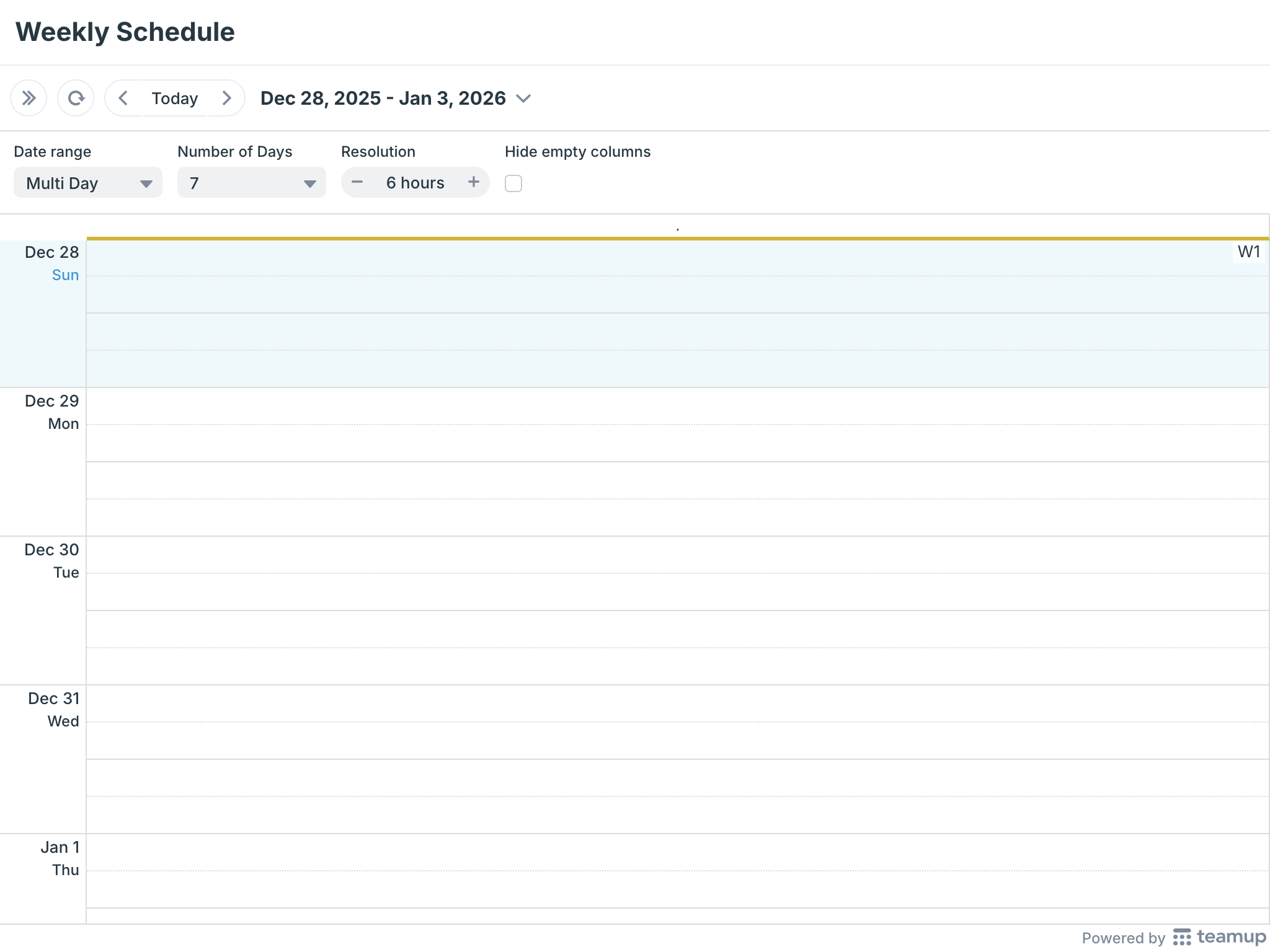 - Calendar views: Teamup has many unique and adjustable calendar views. Switch to another view in the top right-hand corner. Adjust the settings and calendar resolution for the best display for your purposes.